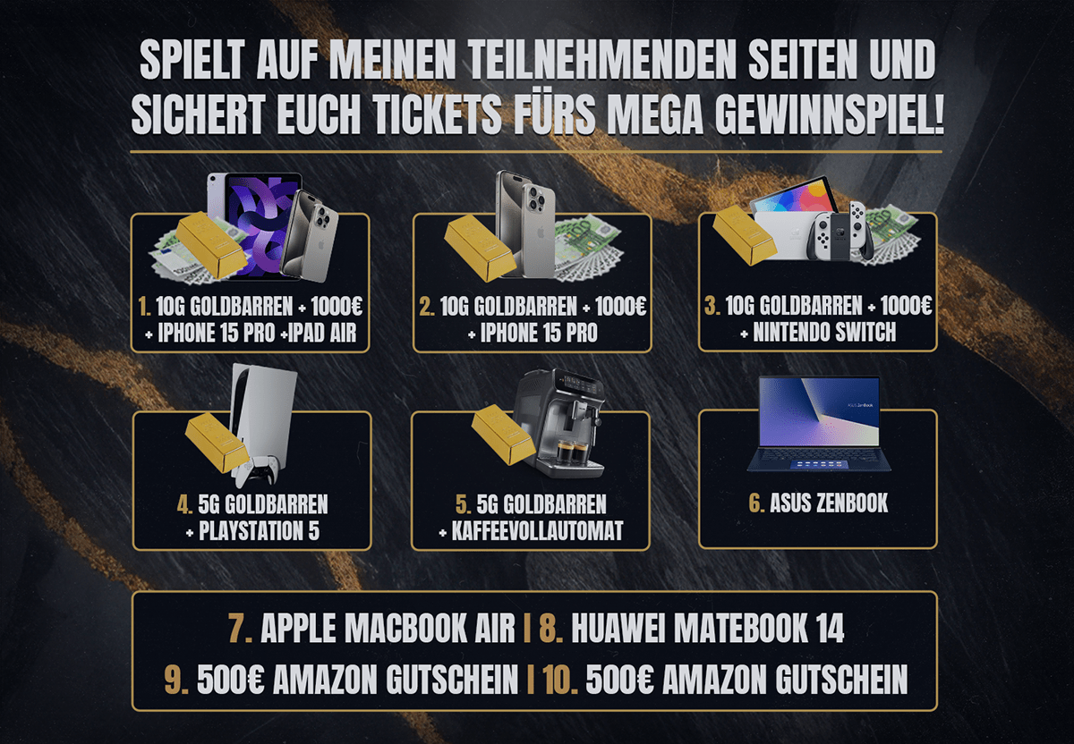 Teilnahmebedingungen: Teilnahme ab 18 und nur mit über meine Website erstelltem Account. Doppelaccounts nehmen nicht teil. Teilnahme nur bei qualifizierten Casinos möglich. Das Gewinnspiel endet am 05.08.24 um 23:59 Uhr! Alle Gewinne werden überprüft vom Casino. Bei weiteren Fragen einfach mir auf Facebook/Instagram schreiben. Irrtürmer vorbehalten. Der Rechtsweg ist ausgeschlossen.